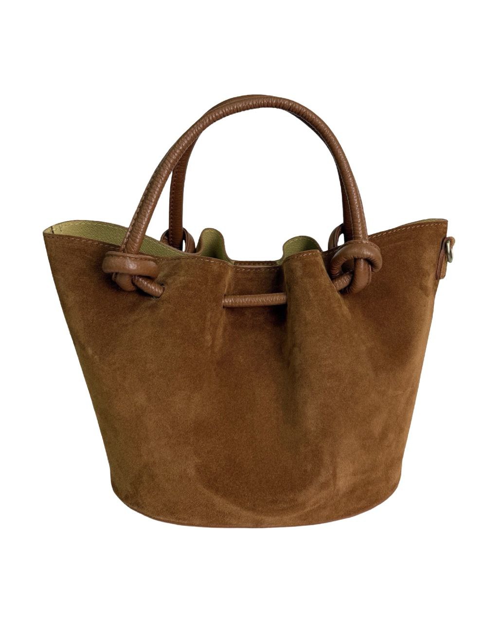 Made from 100% premium Italian leather, it features soft suede, unique knotted handles, and a removable adjustable strap.